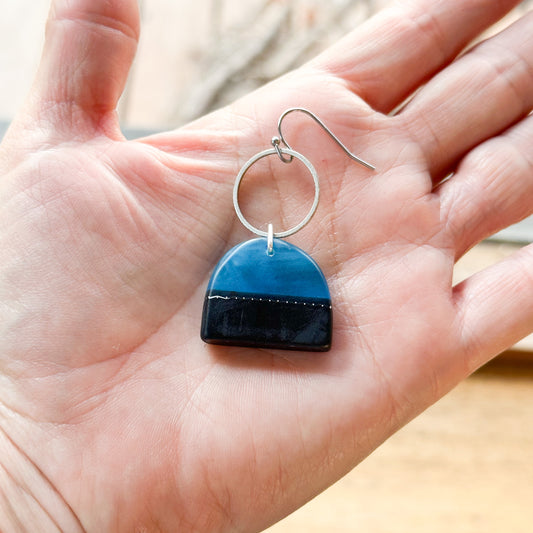 Midnight muse: cobalt and blue black bio-resin drop earrings with silver circles