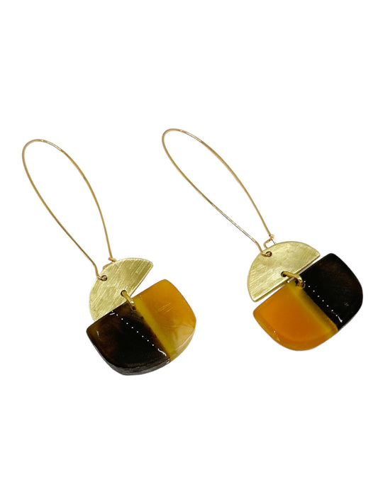 Walkerville wanderings: contemporary resin drop earrings contrast black with smokey blue and warm amber geometric accent with a brushed brass detail