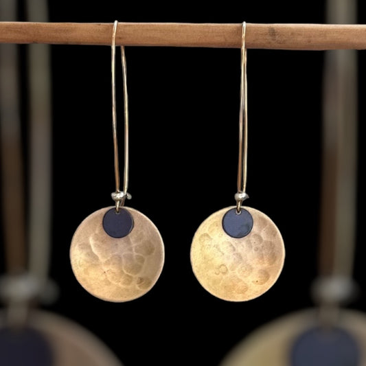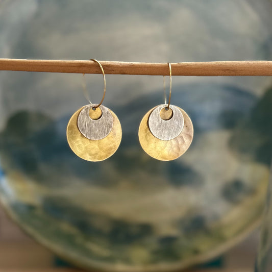 Wanderers: beaten brass discs with silver plated concave disc on gold hoops
