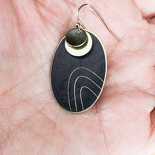 Wanderers: hand etched discs on black patina with brass details
