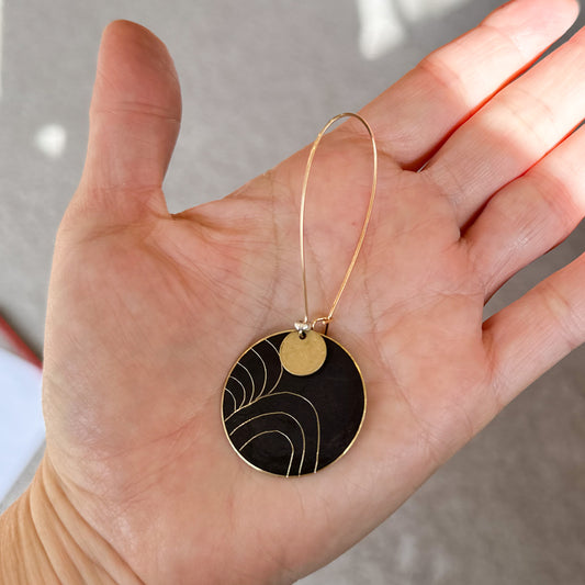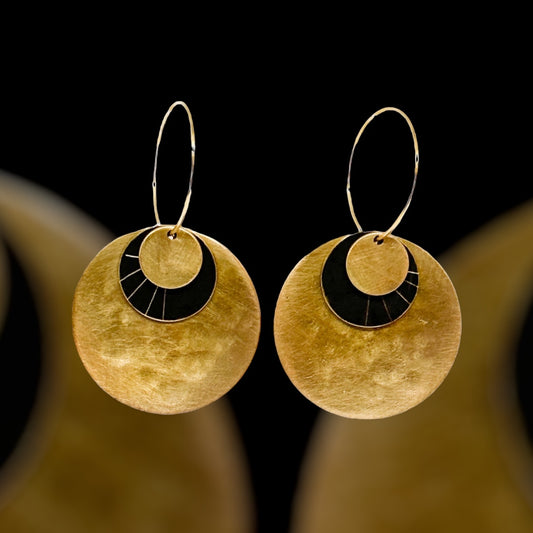 Wanderers: beaten brass disc hoops with hand etched patina metal details