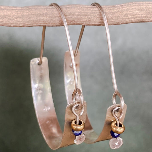 Swinging Sisters, textured sterling silver hoop earrings, featuring lapis lazuli and brass bead detail.