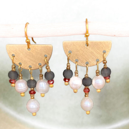 Ooh La La earrings. Featuring fancy fresh water pearls, garnet and glass beads. Gold plated earring hooks.