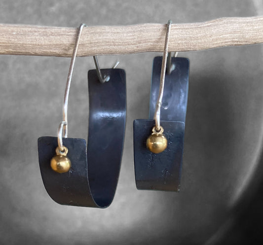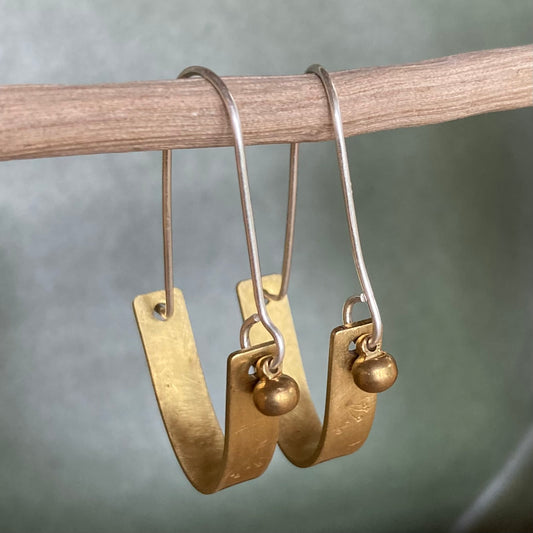 Swinging Sisters, brass and sterling hoop earrings. Featuring embossed detail and brass drop for extra fabulousness.