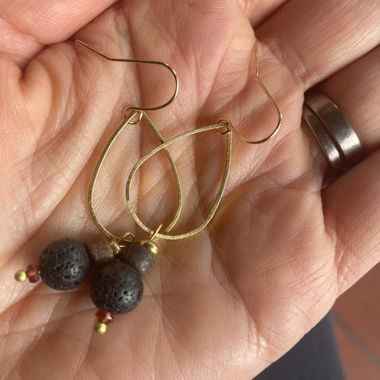 Yogis choice. Brass drop earrings, featuring lava stone and garnet bead, with gold plated hook.